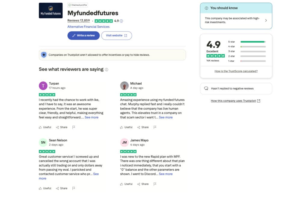 Within the futures trading community, My Funded Futures is generally viewed as a legitimate and structured prop firm and has over 13,800 reviews on Trustpilot with a rating of excellent, 4.9. It may not have the same level of brand recognition as some of the largest firms, but it has developed a reputation for clarity and consistency. Trader feedback suggests that payouts are processed reliably when rules are respected, though, as with all prop firms, individual experiences can vary. Issues that arise are often linked to misunderstandings around drawdown mechanics or withdrawal thresholds rather than arbitrary payment denials. Online discussions and reviews tend to highlight the firm’s straightforward rules and manageable evaluation structure. As with all prop firms, opinions vary based on individual outcomes, but the overall perception places My Funded Futures among the more methodical and rule-driven options in the futures prop trading space. For futures traders who value clarity, discipline, and a direct path from evaluation to funded trading, My Funded Futures represents a credible option within the broader prop trading ecosystem.
