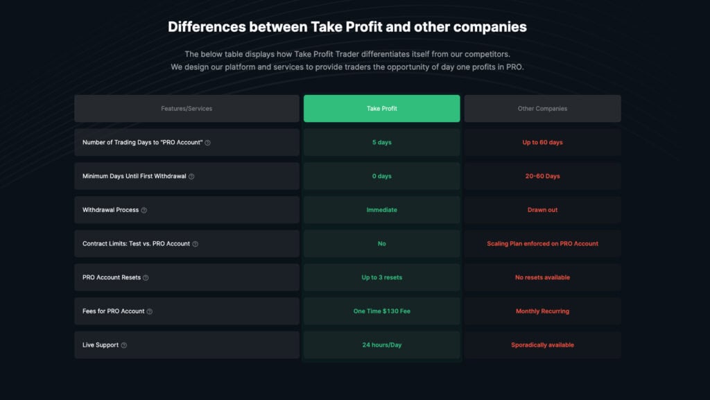 Take Profit Trader is a prop trading firm focused on providing capital to individual traders who demonstrate profitable and disciplined trading performance, specifically in futures markets. Rather than functioning as a traditional broker where traders risk their own capital, Take Profit Trader allows traders to earn access to funded accounts by passing a structured evaluation. Once funded, traders can withdraw profits under the firm’s payout policies. The firm operates a business model common among modern prop firms: individuals pay to enroll in an evaluation, meet the performance criteria, and then get access to firm capital. The primary differentiators that Take Profit Trader promotes include day-one payout access, clear trading rules, and a focus on futures contracts execution with industry-standard platforms