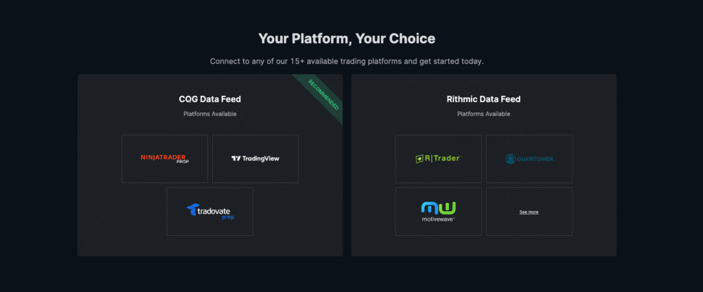 Once an evaluation account is selected, traders complete the checkout process and receive access to the trading environment. At this stage, traders connect their account to one of the supported futures trading platforms. Because Take Profit Trader integrates with established platforms rather than proprietary software, many traders find this step familiar. Platform credentials and data feed instructions are provided through the dashboard, allowing traders to begin trading without unnecessary setup delays.
