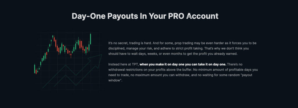 One of the defining features of their payment model is that traders do not need to wait for extended periods before becoming eligible to request withdrawals. Unlike some prop firms that impose minimum trading day requirements or multi-week holding periods, Take Profit Trader allows traders to access payouts on day one. This approach appeals strongly to traders who view prop trading as a source of real income rather than a long-term simulation exercise.